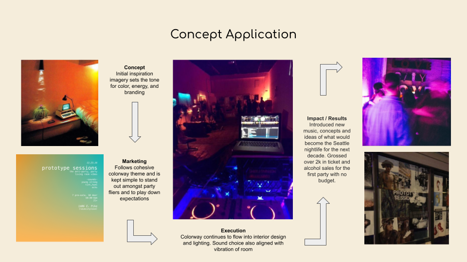 Prototype Sessions was a conceptual art party series, DJ collective, and creative team in Seattle, Wa from 2016-2018. Bridging the ideas of gallery space, parties, and concept retail. I created a formula and design ethos which the concept of all the art, drinks, food, lighting and design projects would follow to create a cohesive idea and energy. The project was a reaction to the voids we saw in the creative communities with a goal to set new standards for ideas and community building.